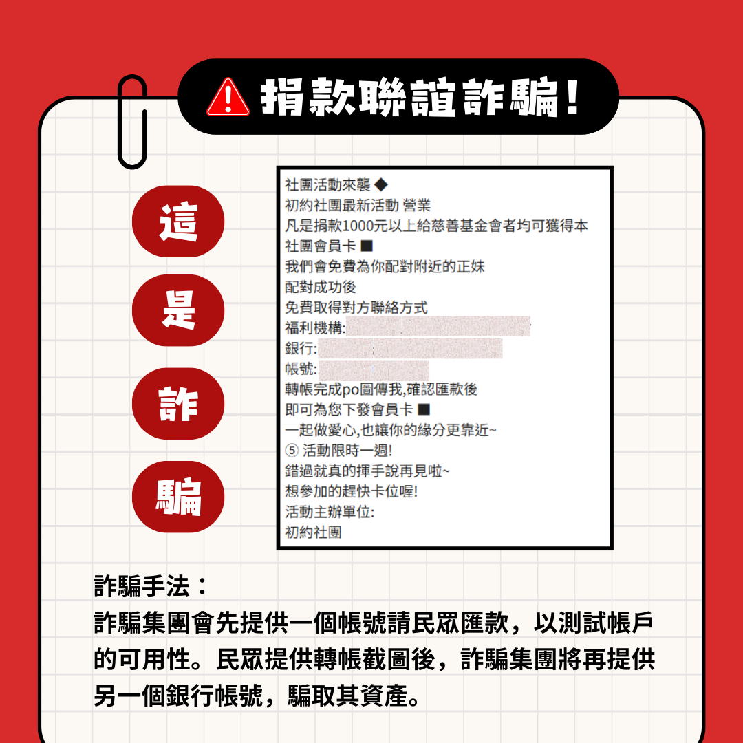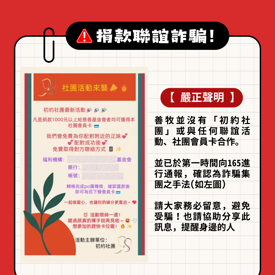 #重要公告 善牧基金會未與任何個人或團體合作「捐款獲聯誼社團會員卡」之活動,特此向社會大眾聲明公告。 善牧稍早已與165進行通報,並由165回覆:確認為詐騙訊息,呼籲大家務必小心,避免受騙! 詐騙集團的作為實在讓人痛心,提醒社會大眾看到網路上流傳信息時,應多方查證,以免被不實訊息誤導,遭受不法人士之欺騙 感謝大家的關注與支持,請協助將本訊息分享出去,讓更多人知情