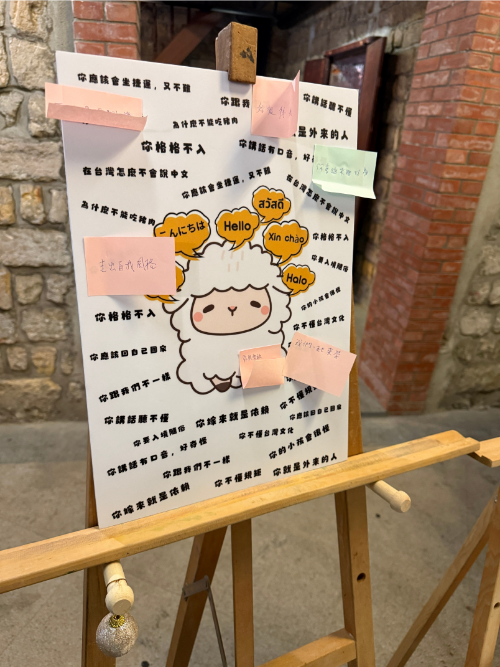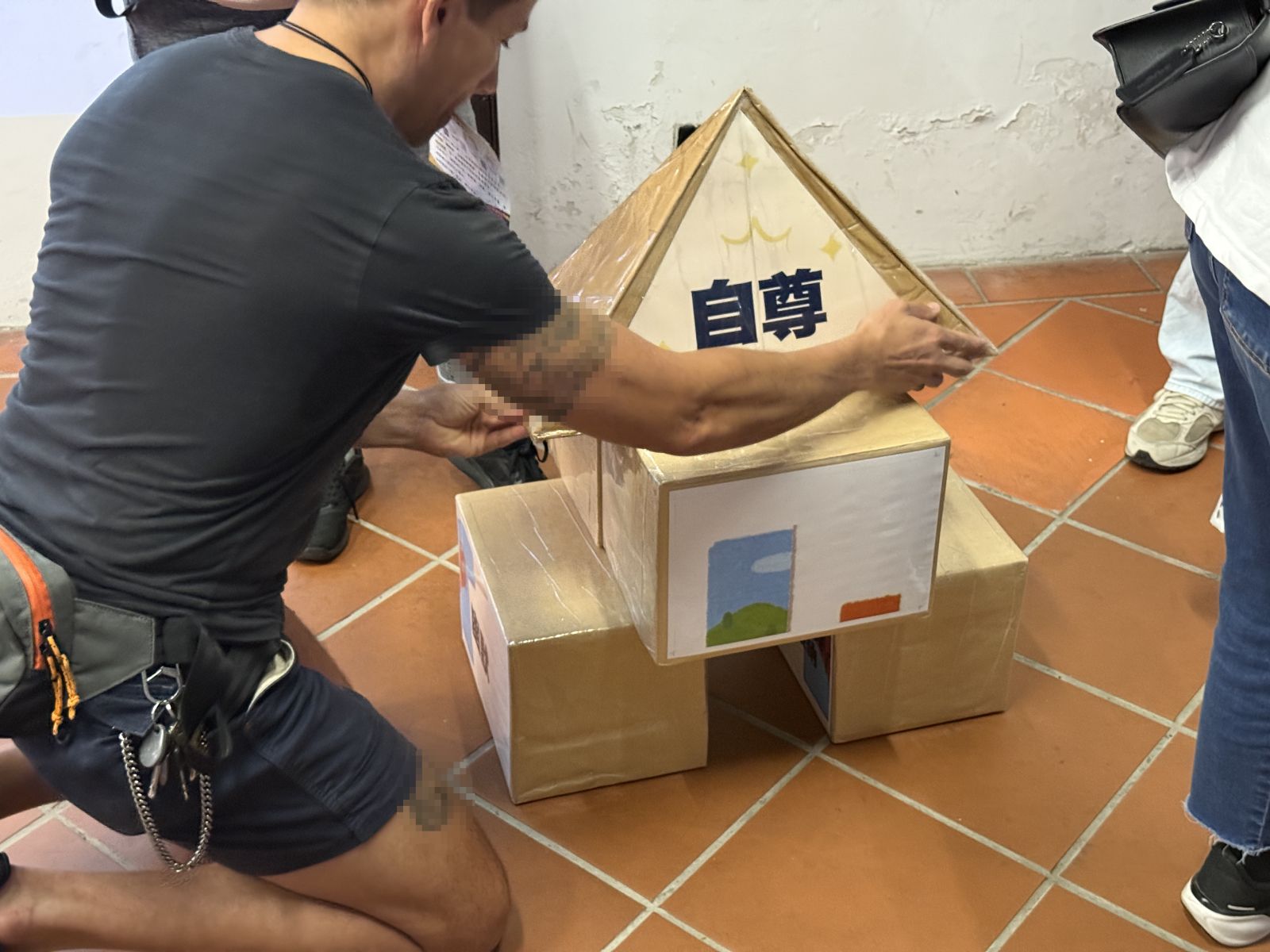 「哭什麼,有什麼好哭的」、「一天到晚只會玩」、「人生沒有救了」……,進入到「自尊」這關,看到小羊們身上都被貼上很多負面標籤,於是邀請大家用正向眼光取代他們身上的壞語句。民眾在這裡會多花一點時間思考怎麼「說好話」,一名伯伯把自己寫的紙條貼在負面標籤上,寫著:「你是可以哭的,不要擔心,我在你旁邊。」