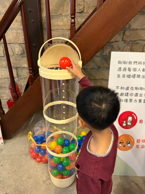 同樂會的關卡以「陪伴」為起點,讓民眾收集屬於自己的復原力積木,看見自己的勇氣與力量,完成闖關活動之前在復原力集氣筒中投下自己最有感觸的復原力。一名大學生民眾與我們分享,身為新住民二代的他在遇到挫折或文化調適上,最大的挑戰是跟自己的家長磨合,即便是處於小小的台灣,在家裡文化和教育習慣與學校感受到的都有些不太一樣,最後他選擇投下屬於「社交技巧與解決事情的能力」的球,因為在磨合的過程中需要不斷思考衝撞,然後找出解決的辦法。