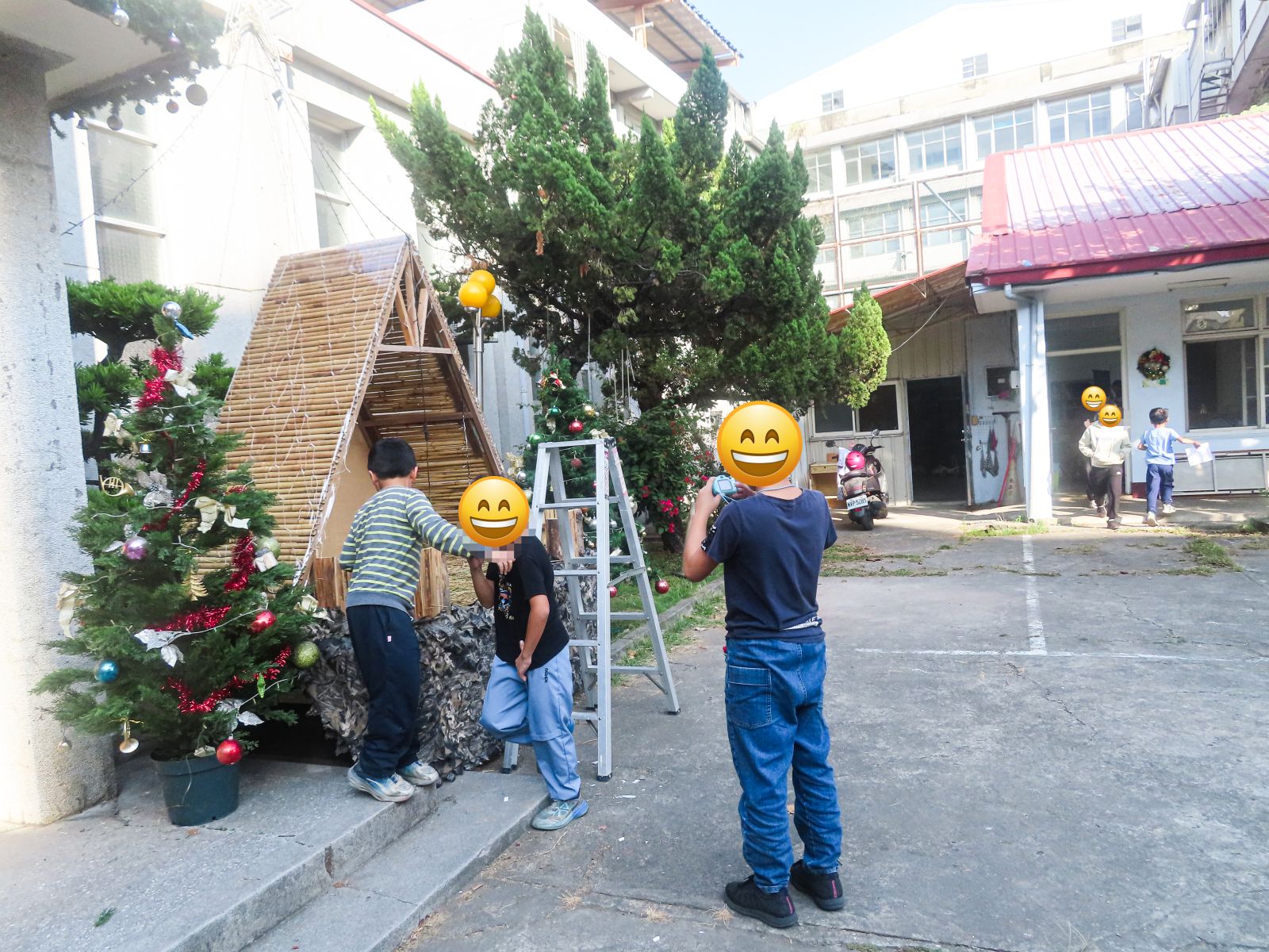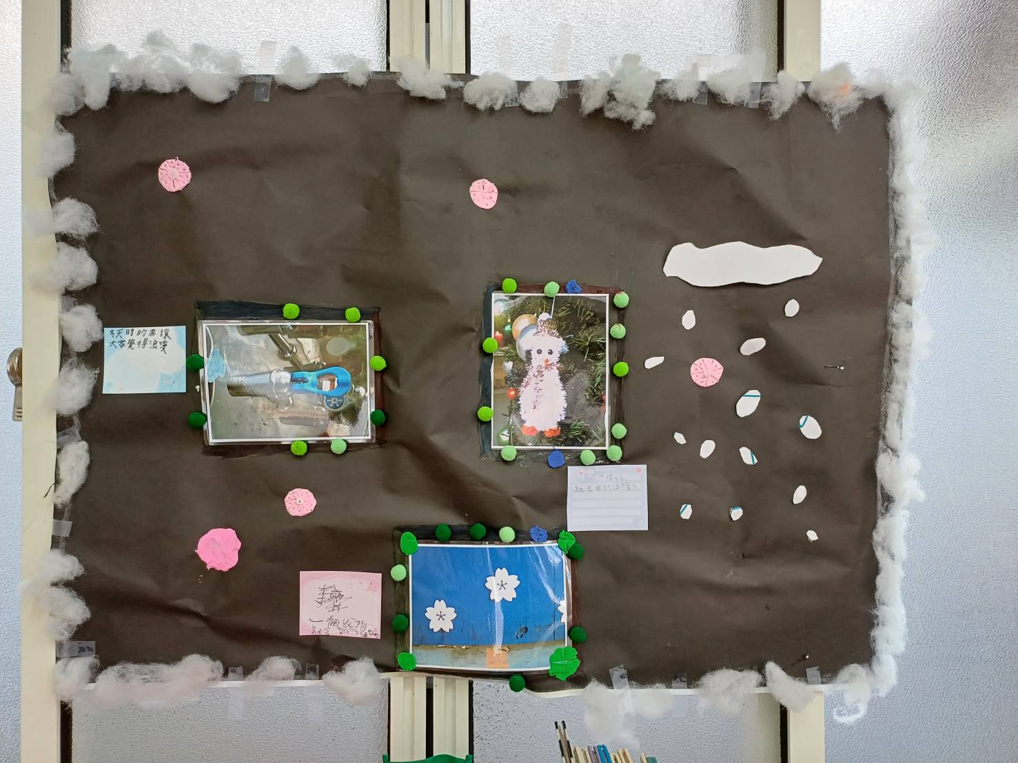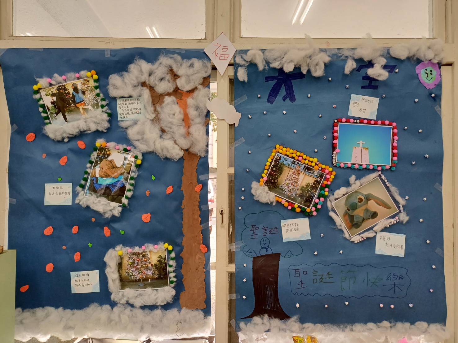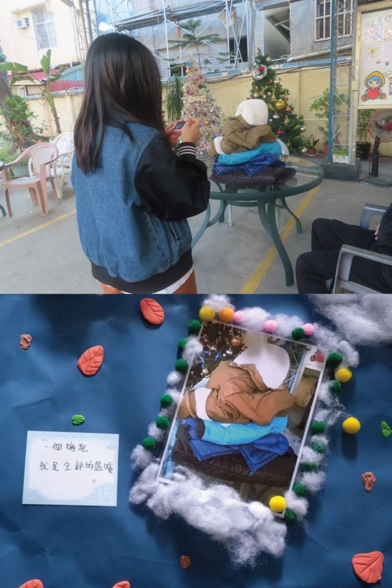 然而,一旦拿起相機,創意的火花卻立刻點燃。在平日上課的教堂裡,一場視覺的尋寶遊戲熱鬧展開—有人專注於冬季的色彩,找到了牆角輕盈的蒲公英、佈告欄上閃亮的雪花鑲嵌;有人為心愛的娃娃導演了一齣冬日童話;更有孩子走直覺式創作—「冬天=雪花」,於是乎堂區內所有與雪花相關的圖騰,全成了鏡頭下的主角,就連飲水機上「冰水」的標誌都入列,讓老師驚呼「這簡直是大家來找碴嘛!」還有還有,那棵由層層冬衣堆疊而成的「聖誕樹」,搭配穿上冬衣、手牽手圍繞的畫面,是孩子眼中對於「溫暖」的詮釋。