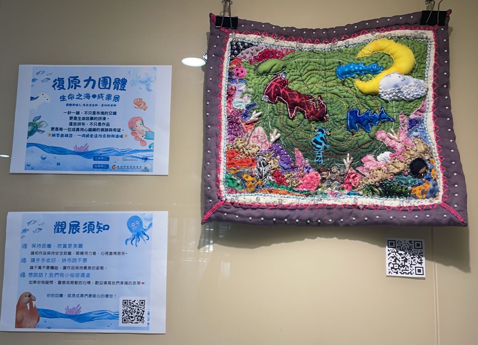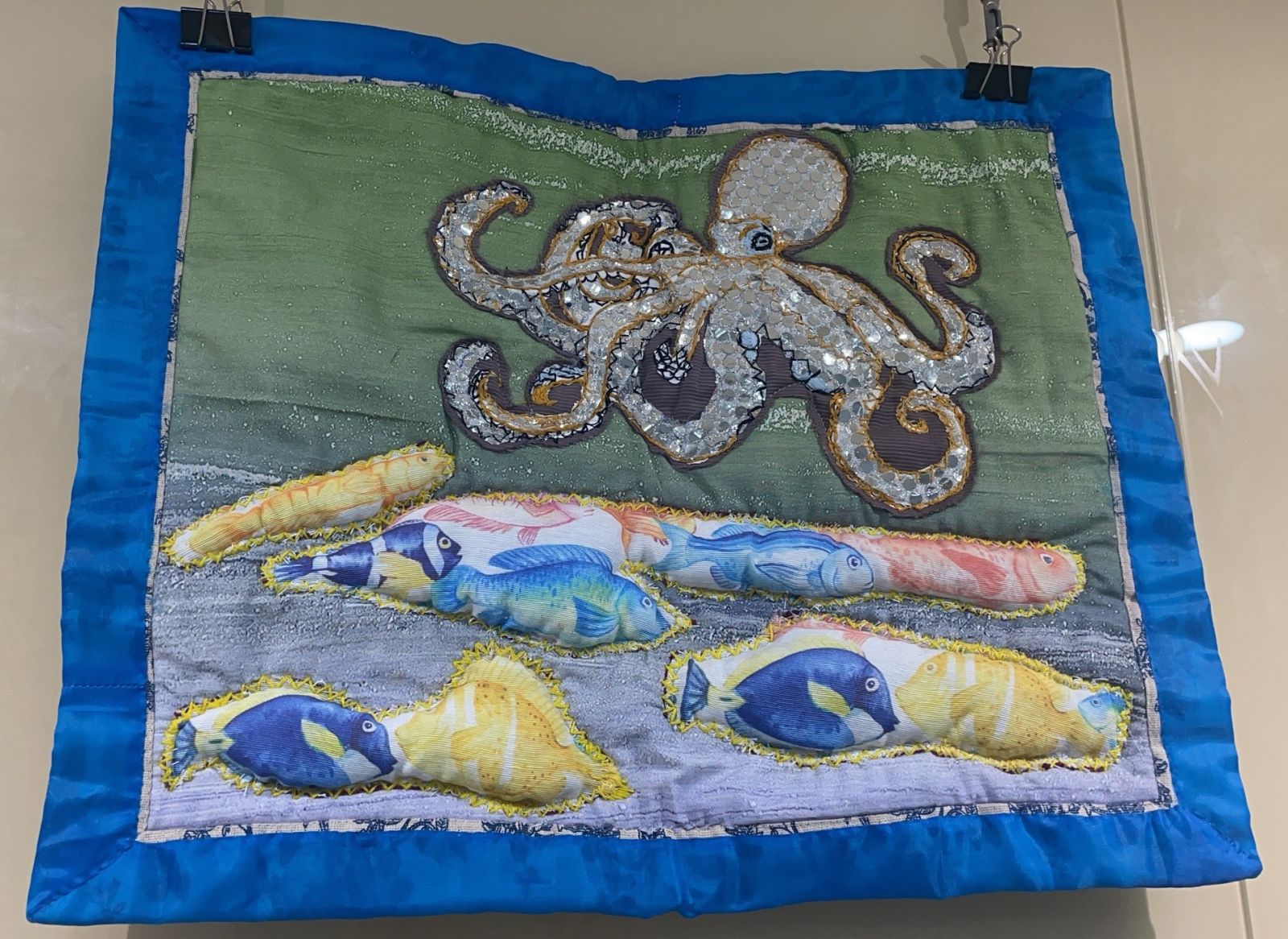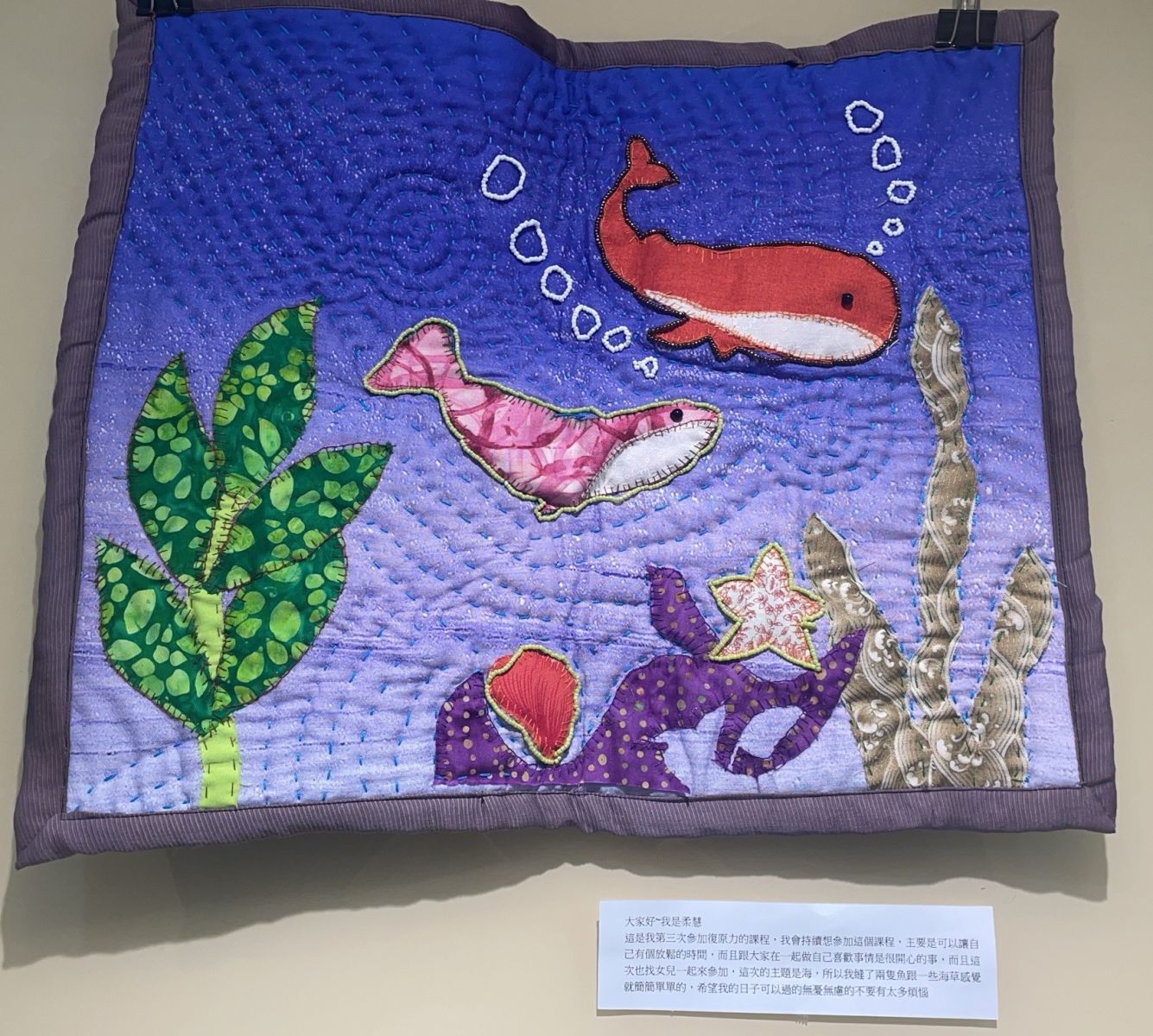 也有學員把章魚打在草稿上,再把草稿和布一起縫,勾勒出做工繁複的八爪章魚,章魚身上綴以銀色亮片,畫面下方運用老師從國外帶回來的魚布,縫成一群群開心的魚群,她分享說:「海裡很熱鬧,魚群們也不孤單。」作品一樣是驚艷全場。