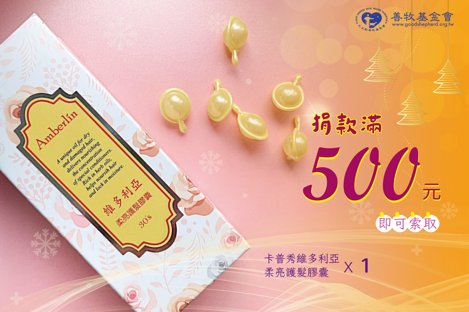 單筆捐款滿500元,可索取卡普秀維多利亞柔亮護髮膠囊1瓶