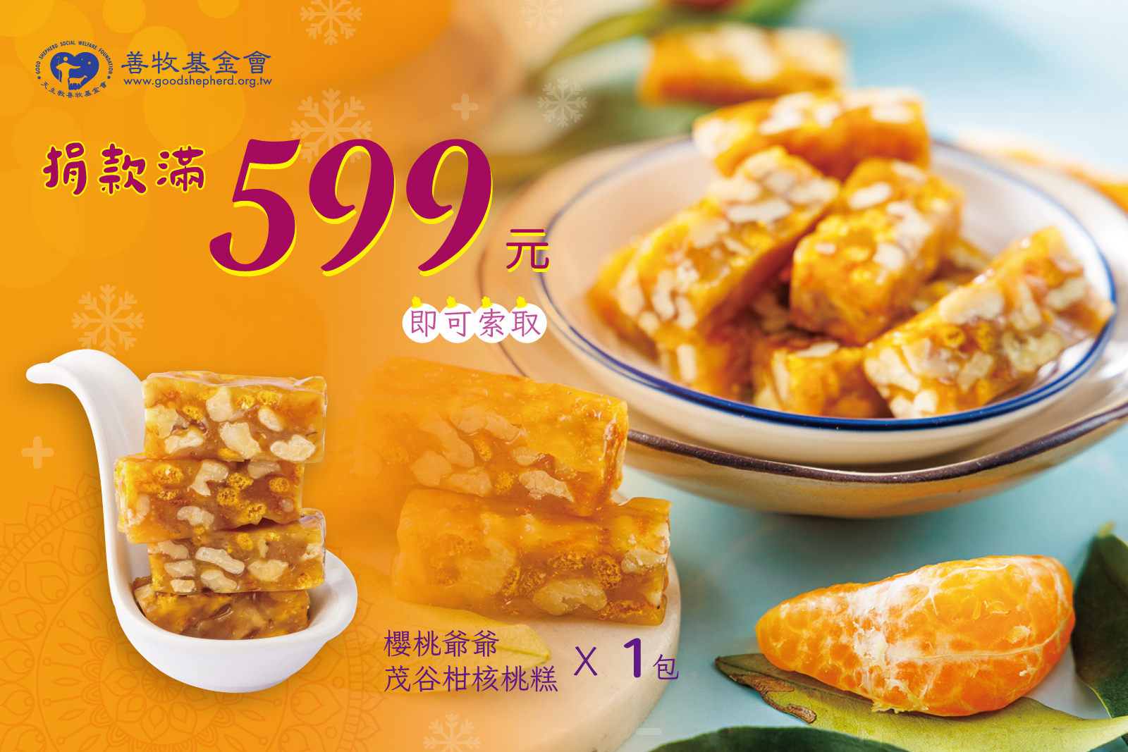 單筆捐款滿599元,可索取櫻桃爺爺茂谷柑核桃糕乙包