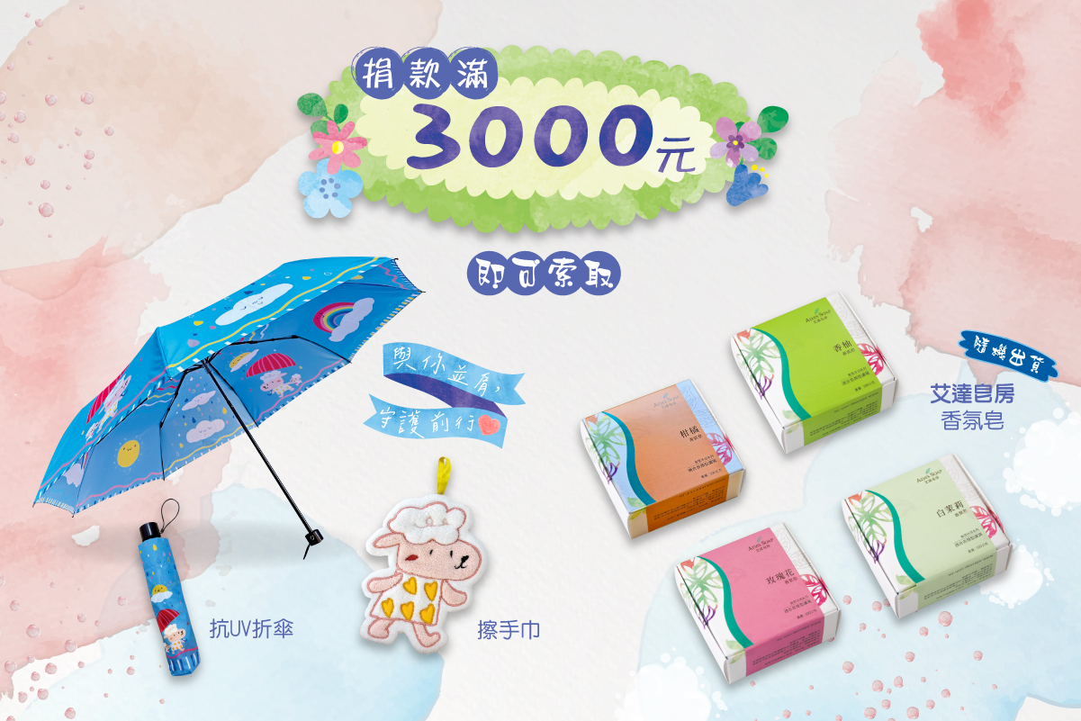 單筆捐款滿3,000元,「與你並肩,守護前行」擦手巾&抗UV折傘+ 艾達皂坊香氛皂(隨機出貨)