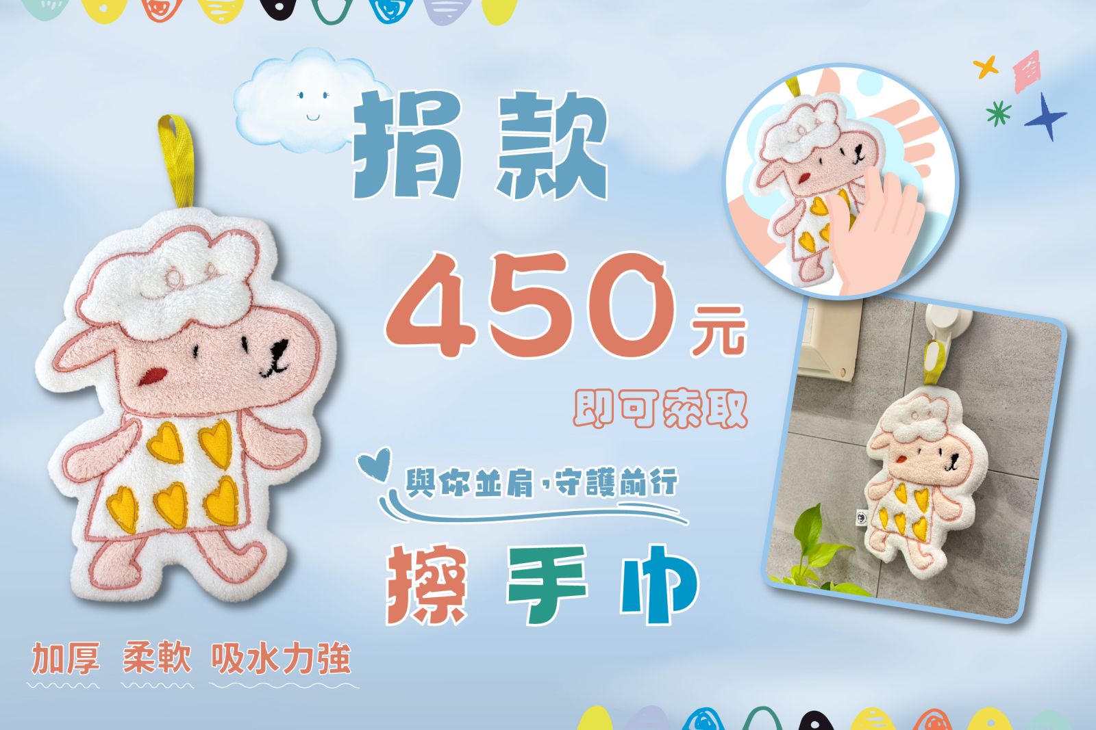 單筆捐款滿450元或月捐滿100元且持續一年,可索取「與你並肩,守護前行」擦手巾